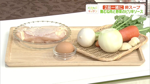 鶏むね肉と野菜のピリ辛ソース & 卵スープ
