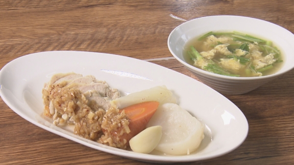 (3)煮た鶏肉と野菜を取り出し、鶏肉を食べ易い大きさのそぎ切りにして、器に盛り、横に野菜を添えます。