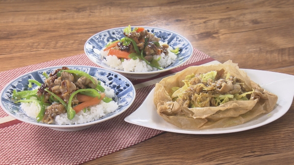 (5)(4)のフライパンが温まったら、空いたスペースにゴマ油を入れて熱し、残りの豚肉を炒めます。豚肉に火が通ったら、ピーマン、人参を入れて炒め合わせ、軽く火が通ったら調味料を加えて、更に炒め合わせます。野菜に火が通って味が馴染んだら、器に盛ったごはんに乗せます。クッキングシートで包んだお肉と野菜も、火がとおったら、熱いうちに頂きましょう。
