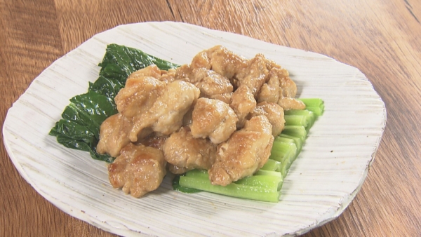 (3)鶏肉に火が通ったら、しょうゆ・酒・てんさい糖を混ぜてから加えて煮絡めます。火を止めてマヨネーズを加え、サックリ混ぜ合わせて照りを出し、小松菜の上に盛ります。