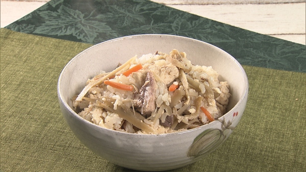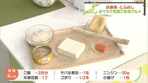 ご飯2合分、木綿豆腐1丁、ゴボウ1/2本、ニンジン30g、小揚げ1枚、サバ水煮缶1缶、油大さじ1杯、水カップ1/2杯