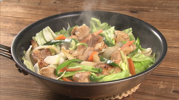 (3)フライパンに油を熱して、鶏肉を調味料ごと入れて焼きます。焼き色が付いたら返し、キャベツ、玉ネギ、ニンジン、ピーマンを入れてフタをして蒸し焼きにします。