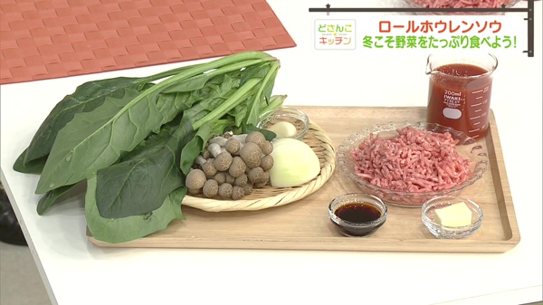 (1)ホウレン草は水に放してパリッとさせて、大きい葉を8枚切り取ります。茎の太いところはタネを巻きやすいように、つぶしておきます。残りのホウレン草は粗く刻んでおきます。