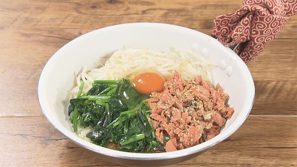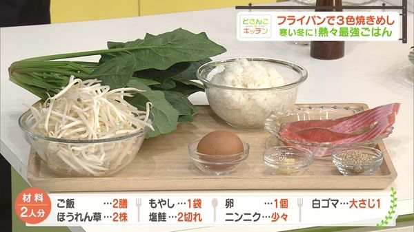 ご飯2膳、ゴマ油大さじ1杯、しょうゆ少々、ホウレン草2株、もやし1袋、塩・油各少々、おろしニンニク・塩各少々、塩鮭2切れ、白ゴマ大さじ1杯、卵1個