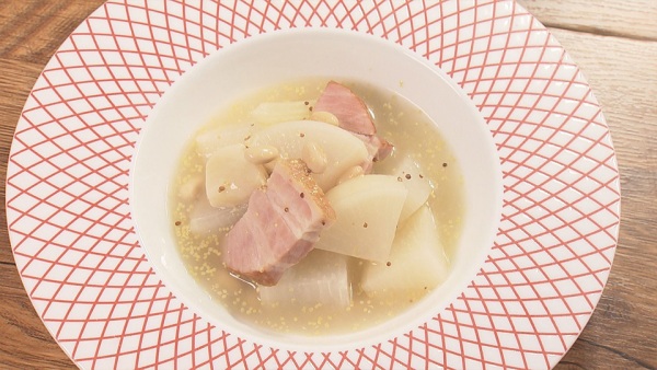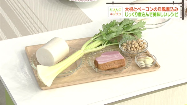 大根400g、ブロックベーコン200g、ニンニク4片、セロリ1本、ゆで大豆150g、水カップ2杯