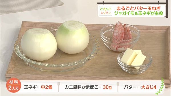 玉ねぎ中2個、カニ風味かまぼこ30g、水カップ3杯、バター大さじ4杯、しょうゆ大さじ2杯、酒大さじ2杯、コショウ少々