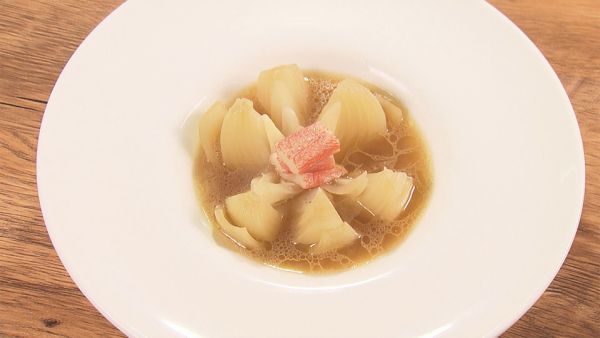 (3)カニかまぼこは長さを1/2にして汁に入れて温め、器に盛った玉ねぎを、花のように開いて、中央にのせ、煮汁をたっぷり注ぎます。