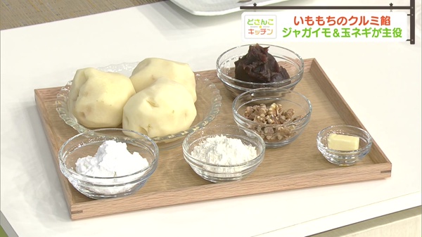 ジャガイモ正味600g、片栗粉60g、小麦粉30g、こしあん150g、クルミ30g、バター大さじ1杯