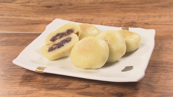 (3)(1)の生地が熱いうちに、丸く伸ばして餡を包み、少し押さえて平らにします。
