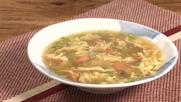 (3)水溶き片栗粉でトロミを付け、溶き卵を細く流し入れ、軽く混ぜて仕上げます。