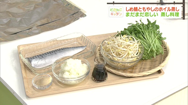 しめ鯖1枚、大豆もやし1袋、豆苗1パック、コショウ少々、ショウガ1片分、酒大さじ2杯