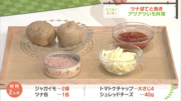 ジャガイモ2個、ツナ缶1缶、塩・コショウ各少々、トマトケチャップ大さじ4杯、シュレッドチーズ40g、パセリのみじん切り少々