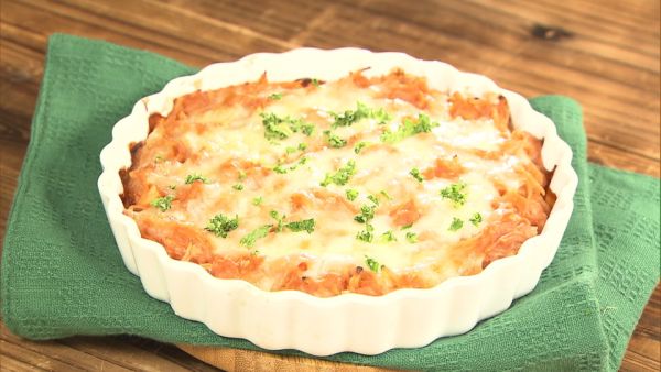 (1)ジャガイモは皮をむき、千切りつき器で千切りにします。油ごとツナと混ぜ、塩、コショウ、トマトケチャップを加えて混ぜ、耐熱容器に平らに入れます。