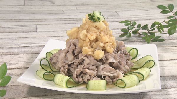 しゃぶしゃぶを一皿の料理にしました。おろしを掛けてさっぱりといただきますが、おかきを入れる事で噛んだ時の歯ごたえ、そして特別の味わいが生まれました。考えていなかった歯ごたえや香ばしさは嬉しいものですね。