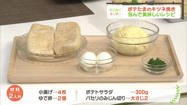 小揚げ4枚、ゆで卵2個、ポテトサラダ300g、パセリのみじん切り大さじ2杯、油大さじ1杯、しょうゆ小さじ2杯、みりん小さじ1杯