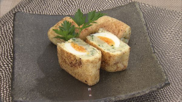 小揚げにポテトサラダとゆで卵を詰めて、香ばしく焼きました。小揚げの味わい、ゆで卵が入っている意外性、切った時の彩りを楽しんで頂ける一品です。手軽だけれど愉快な料理です。楽しんでお作り下さい。