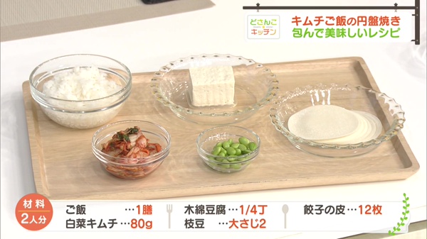 ご飯1膳、白菜キムチ80g、木綿豆腐1/4丁、枝豆大さじ2杯、しょうゆ・ゴマ油各小さじ1杯、餃子の皮12枚、油大さじ1杯