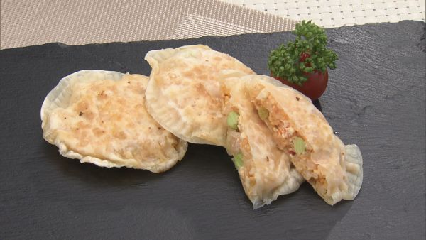 (3)餃子の皮の周りに水をつけ、ご飯の具材をのせて、もう一枚を重ねてフォークで押さえて閉じます。同様に、残り5個も包みます。