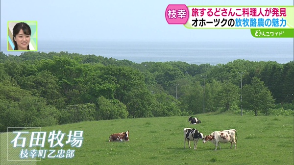 「豊かな枝幸の酪農」を象徴する風景があると聞き、重松さんの放牧仲間・石田さんの牧場へ。海の見える草地で牛たちが美味しいミルクを育む様を見ることができます。