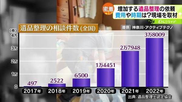 近年、遺品整理を業者に依頼する人が増加しています。遺品整理士認定協会によりますと、2017年に497件だった相談件数は、2022年には3万8009件にまで増えています。