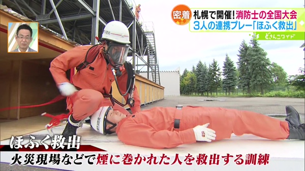 団体戦には札幌市厚別消防署の3人が挑みます。出場競技は、チームワークがモノをいう「ほふく救出」です。