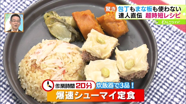 かにチャーハン、しいたけシューマイ、蒸し野菜の3品を、炊飯器で一気に作ることができます。