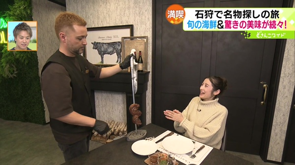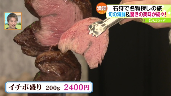 ウリセスさんのオススメは、牛1頭からわずか2キロ〜4キロしか取れない希少部位のイチボ。目の前で豪快にスライスしてもらえます。