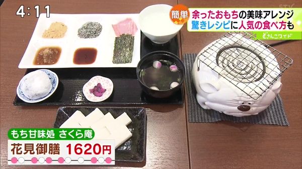 ●花見御膳 1620円人気もち屋さん「一久大福堂」が手掛ける甘味処です。「花見御膳」は、自分でお餅を焼きながら6種類のトッピングを楽しめます。