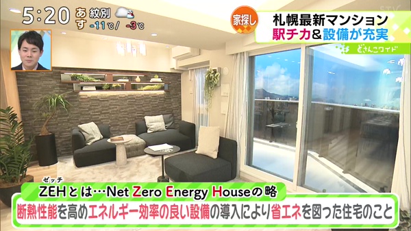 こちらは豊平区の分譲マンションの中では初めて建てられる「ZEH(ゼッチ)」の物件です。年間で使用するエネルギーをおよそ25%も削減でき、経済的でエコに繋がります。
