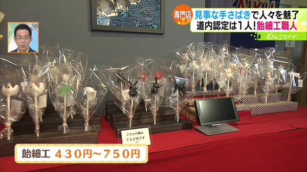 北海道で唯一という飴󠄀細工師・小笠原豊さんが作る飴󠄀細工が、店内に所狭しと並べられています。