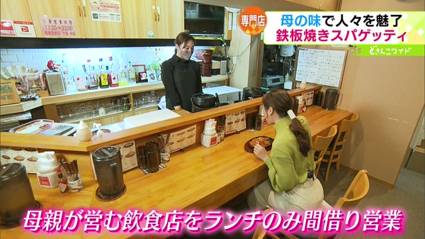 鉄板焼きのスパゲッティが楽しめる専門店です。お母さんが営む夜の居酒屋店舗を、昼の間だけ間借りしてオープンしています。