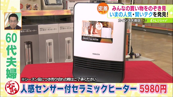 冬の時期、特に人気なのが“暖房器具”です。60代のご夫婦が買ったのは「人感センサー付 セラミックヒーター」。センサーが気配を感知し、人がいるときだけ運転するので省エネです。