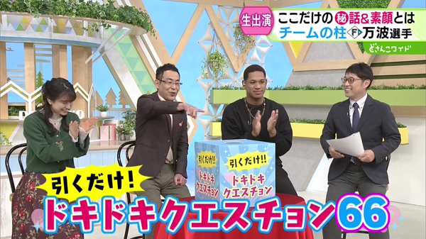 ファイターズ特別編!万波選手がスタジオ生出演 12/4(水) 掃除グッズのプロ厳選!大掃除お助けアイテム 12/6(金) 若き敏腕シェフが参戦!下國伸さんと福さんぽ 2024年12月5日(木) ファイターズ特別編!万波選手がスタジオ生出演 プロ野球・北海道日本ハムファイターズの万波中正選手を徹底解剖!今シーズンについてなど、様々なことを伺いました。 2019年ドラフト4位でファイターズに入団、2年連続でゴールデングラブ賞を受賞した万波中正選手。今回は質問カードに答えていく“質問コーナー”や、毎年恒例“ファイターズ納会ゴルフ”の様子もお送りしました。 12/4(水) 掃除グッズのプロ厳選!大掃除お助けアイテム 12/6(金) 若き敏腕シェフが参戦!下國伸さんと福さんぽ