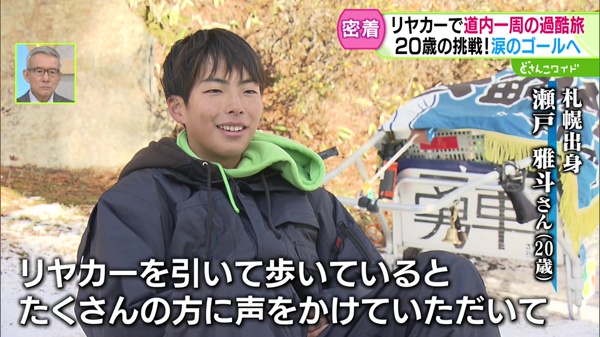 札幌出身の瀬戸雅斗さん(20歳)。今年5月、リヤカーをひいて北海道一周、徒歩の旅に挑戦しました。