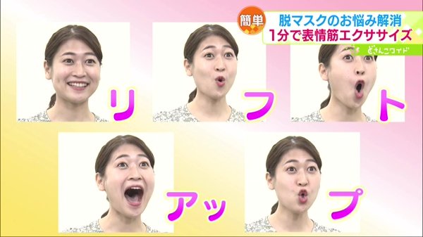 シワ・たるみに!表情筋エクササイズ目を大きく開け、顔の筋肉意識しながら「リ」「フ」「ト」「アッ」「プ」と発音しながら、それぞれ10秒間キープします。