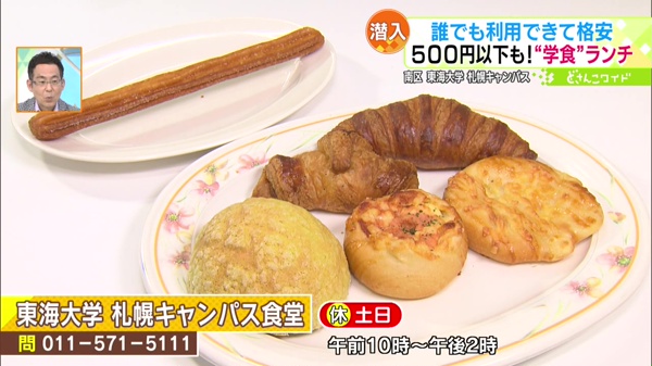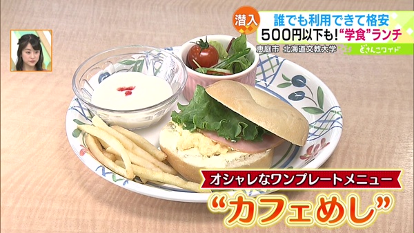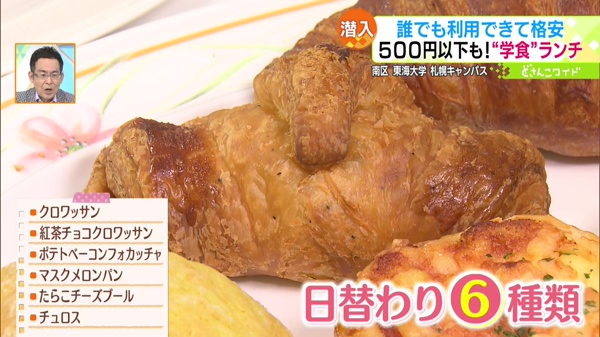学食では和洋中の種類豊富なセットメニューが食べられ、さらに、道内では珍しい、学内で焼き上げるパンを買うことができます。日替わりで種類が変わり、もちろん、一般の方も買うこともできます!お持ち帰りもOKです。