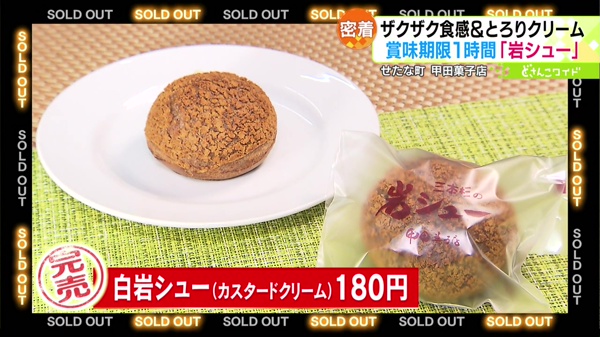 完売グルメのシュークリームは「白岩シュー」。通称・岩シューです。瀬棚の海岸にある岩のようなごつごつとした生地の中には、クリームがたっぷり!最大の特徴は“賞味期限が1時間”なことです。