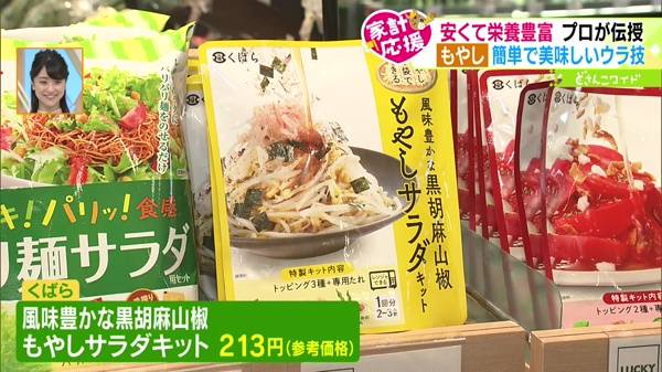 ●くばら 風味豊かな黒胡麻山椒 もやしサラダキット 213円(参考価格)