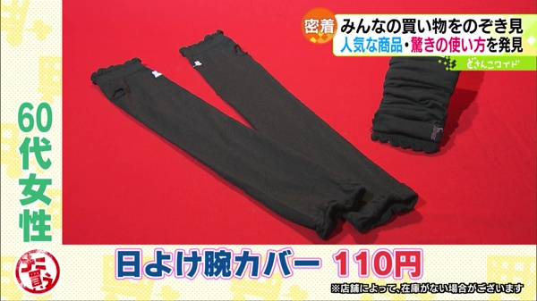 ●日よけ腕カバー 110円接触冷感素材でできた腕カバー。長さ48cmあり、肘上まで日差しから守ってくれます。