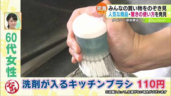 ●洗剤が入るキッチンブラシ 110円ブラシの上に付いている容器に洗剤を入れることができます。容器の上のフタを押すと洗剤が出てきて、そのまま食器を洗えます。