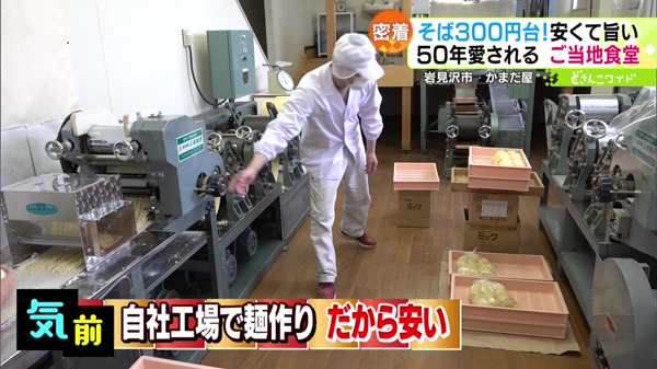 安さの秘密は自社工場で麺を作っているから。かまだ屋ではそば、うどん、ラーメンを効率よく製造しています。
