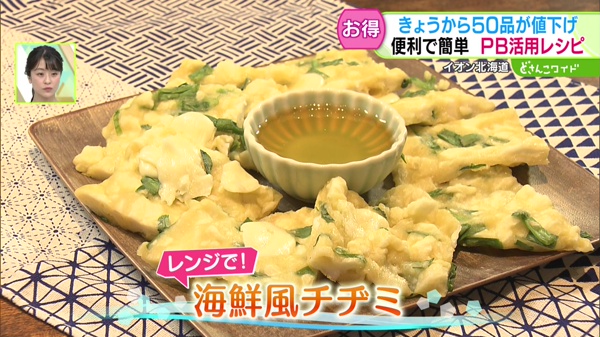 冷麺に合うおかずも作っていただきました。もっちもちの「チヂミ」です。トップバリュの“はんぺん”と“チーズ”を入れることで、海鮮チジミのような風味に。電子レンジで作ります。