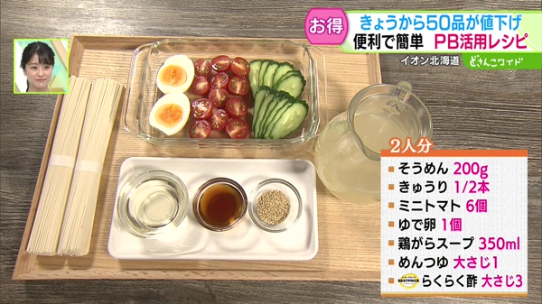 まずは、“かんたん便利ならくらく酢”を使った、ぶっかけスタイルの「冷やしそうめん」を教えていただきました。トップバリュの“ビーフジャーキー”も使用しています。