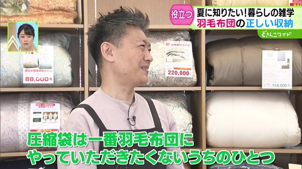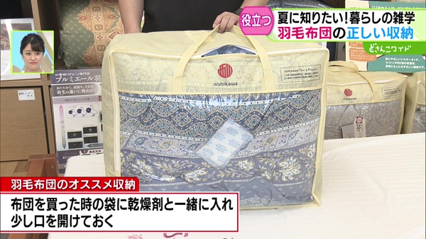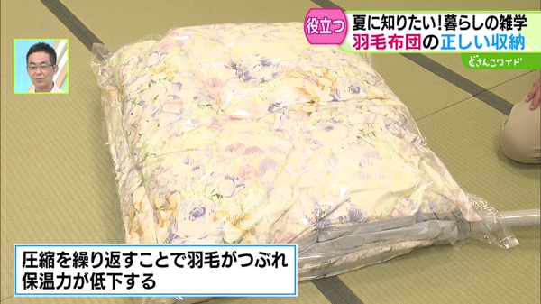 続いては「羽毛布団」のしまい方。西区にある“八田ふとん店”の八田崇志さんによると、羽毛布団は布団乾燥機等を使って、湿気を逃がしてから収納するのがオススメ。収納する際のNGも教えていただきました。
