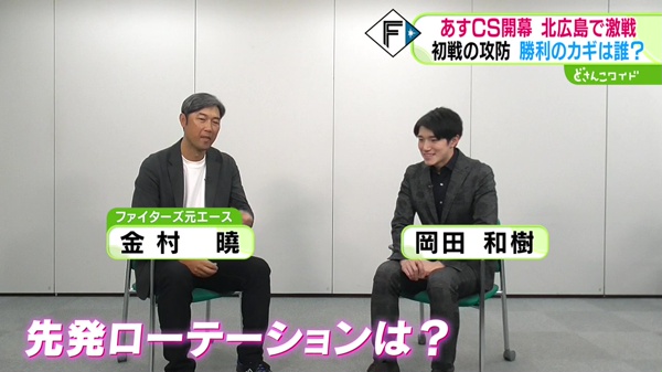 ファイターズ元エース・金村曉さん(写真左)に投打のポイントを伺う岡田アナ(写真右)