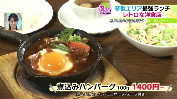 人気のメニューは「煮込みハンバーグ」。自家製ソースで煮込まれたハンバーグと半熟卵の相性は抜群です。