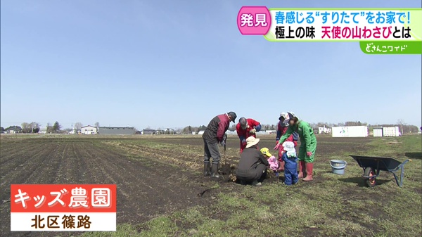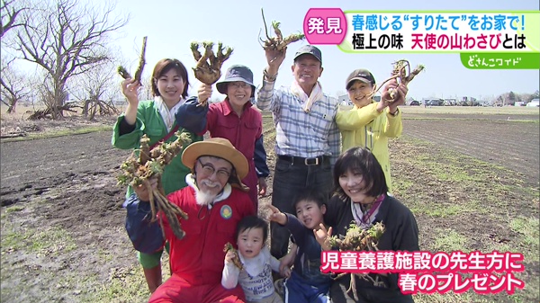 キッズ農園はNPO法人が児童養護施設の支援のために作っている農園で、育てた野菜を施設に寄付し、施設の子どもたちの食育活動にも役立てています。春一番の収穫が“山わさび”で、この日は法人の皆さんが掘り起こしていました。