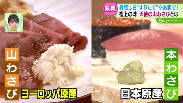 わさびにはゴツゴツ大きい“山わさび”と、小柄で緑色の“本わさび”があります。生まれも違って、山わさびはヨーロッパ原産、本わさびは日本原産。どちらのわさびも、肉や魚を食べる時の食中毒を防ぐ役割を担ってきました。