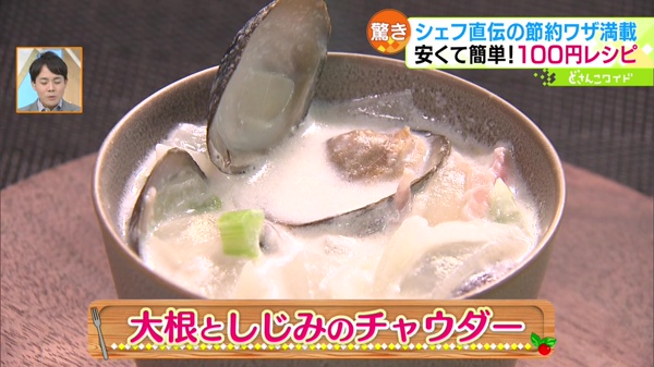 (5)牛乳を加えて沸騰させたら、大根の葉としじみを加え、塩で味を調えます。
