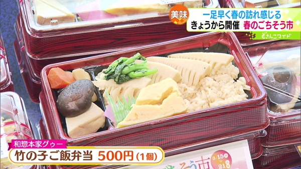 ●和惣本家グゥー「竹の子ご飯弁当」500円(1個)和食お惣菜の店“和惣本家グゥー”では、「竹の子ご飯弁当」が登場しました。春の味覚・大きな竹の子の柔らかい穂先だけを使用しています。